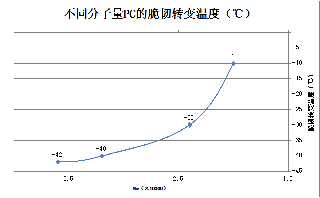 ????????對(duì)于有低溫韌性要求的材料來(lái)說(shuō),脆韌轉(zhuǎn)變溫度是一個(gè)重要參數(shù),PC分子量對(duì)其脆韌轉(zhuǎn)變溫度有重要影響。在PC分子量較高時(shí),其脆韌轉(zhuǎn)變溫度隨分子量下降而升高并不明顯,如PC分子量由3.6萬(wàn)下降到3.2萬(wàn)時(shí),其轉(zhuǎn)變溫度由-42℃只提升了2℃到-40℃;而PC分子量下降到中等分子量以下(≤2.4萬(wàn))時(shí),其脆韌轉(zhuǎn)變溫度快速上升,由PC2.4的-30℃上升20℃到PC2.0的-10℃??梢?jiàn),要想制備低溫韌性較好的PC,保持PC較高的分子量是很有必要的。