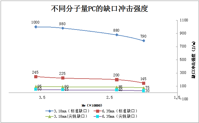 ????????PC樣條的厚度由3.18mm增加到6.35mm時(shí),各分子量PC的缺口沖擊強(qiáng)度數(shù)值下降為原來(lái)的20%-25%左右。將樣條缺口由標(biāo)準(zhǔn)缺口改為尖銳缺口時(shí),沖擊強(qiáng)度數(shù)值呈現(xiàn)大幅下降,3.18mm樣條各PC下降到不足原來(lái)10%,;而6.35mm樣條尖銳缺口的沖擊數(shù)值下降到原來(lái)標(biāo)準(zhǔn)缺口的1/5左右,均表現(xiàn)出脆性。可見(jiàn),PC對(duì)厚度、尤其是缺口有較強(qiáng)的敏感性,PC分子量較高時(shí)這種敏感性稍有減弱。