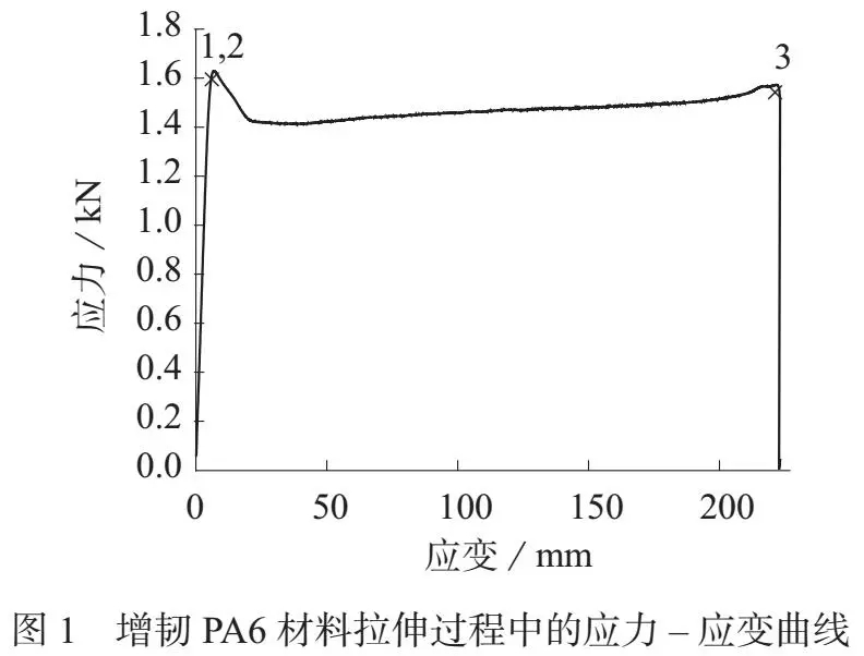 ????????拉伸強(qiáng)度在材料拉伸曲線(xiàn)中的位置如圖1 中的1 點(diǎn)所示。從表1 可以看到,一次擠出過(guò)程得到的增韌PA6 材料的拉伸強(qiáng)度為48.18 MPa,但是經(jīng)過(guò)二次擠出過(guò)程后,增韌PA6 材料的拉伸強(qiáng)度下降為41.47 MPa。