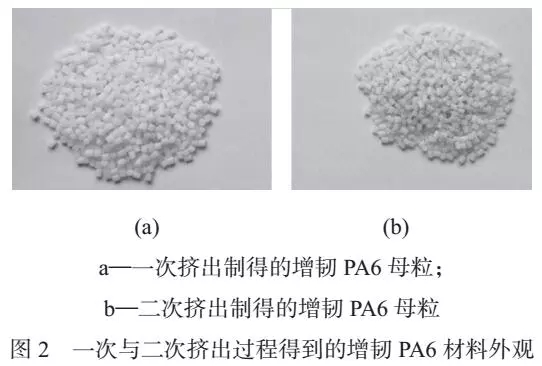????????在二次擠出過(guò)程中雖然加入了與一次過(guò)程等量的抗氧劑,但是增韌PA6 材料仍然發(fā)生了明顯的氧化現(xiàn)象,一次與二次擠出過(guò)程得到的增韌PA6 材料外觀如圖2 所示。從圖2 可以看到,二次擠出過(guò)程得到的增韌PA6 顆粒顏色明顯比一次擠出過(guò)程顆粒顏色深,說(shuō)明二次擠出過(guò)程增韌PA6 材料發(fā)生了更多的氧化降解,因此二次擠出過(guò)程中得到的增韌PA6材料的拉伸強(qiáng)度更低。