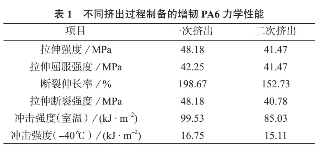 ????????以PA6、聚烯烴增韌劑、抗氧劑為原料,研究一次擠出和二次擠出制備的增韌PA6 材料的拉伸強(qiáng)度、拉伸屈服強(qiáng)度、斷裂伸長(zhǎng)率、拉伸斷裂強(qiáng)度、室溫和–40℃沖擊強(qiáng)度?。