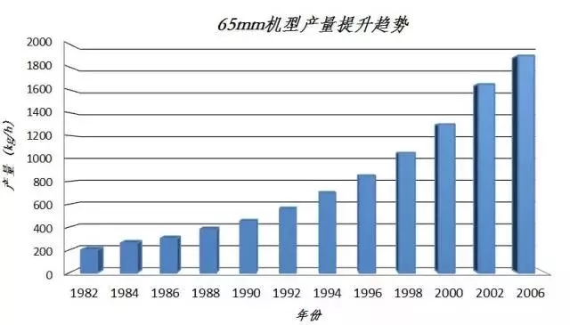 ????????由圖可以看到,以65mm機型為例,從1980s到2000s,將近20年時間里產(chǎn)量提升了近10倍。比扭矩從ZSK第一代的4Nm/d3已發(fā)展到18+ Nm/d3,大小徑比從1.22提高到1.80,物料的平均停留時間也由數(shù)十分鐘降低到了僅僅數(shù)十秒。