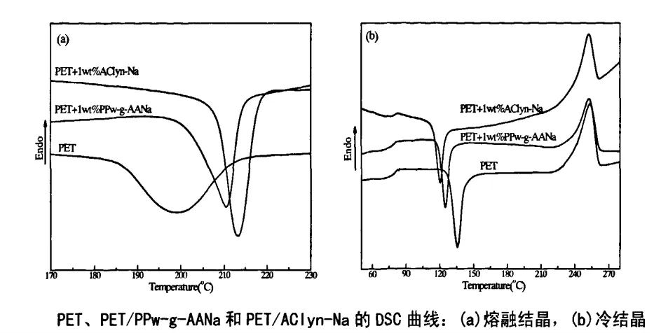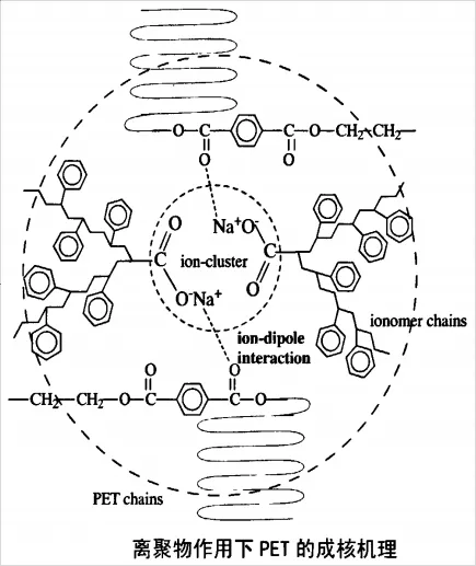 AClyn 285P與PET幾乎不發(fā)生化學(xué)反應(yīng),但PET/AClyn 285P體系擁有較好的相容性說明AClyn 285P的離子聚集體與PET的酯鍵間有離子-偶極作用的存在。AClyn 285P正是通過這種離子-偶極作用誘導(dǎo)了PET鏈段在其離子聚集體周圍進(jìn)行排列形成晶核,進(jìn)而促進(jìn)結(jié)晶。